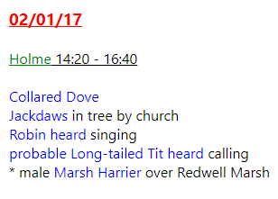 Collared Dove Jackdaws in tree by church Robin heard singing probable Long-tailed Tit heard calling * male Marsh Harrier over Redwell Marsh |